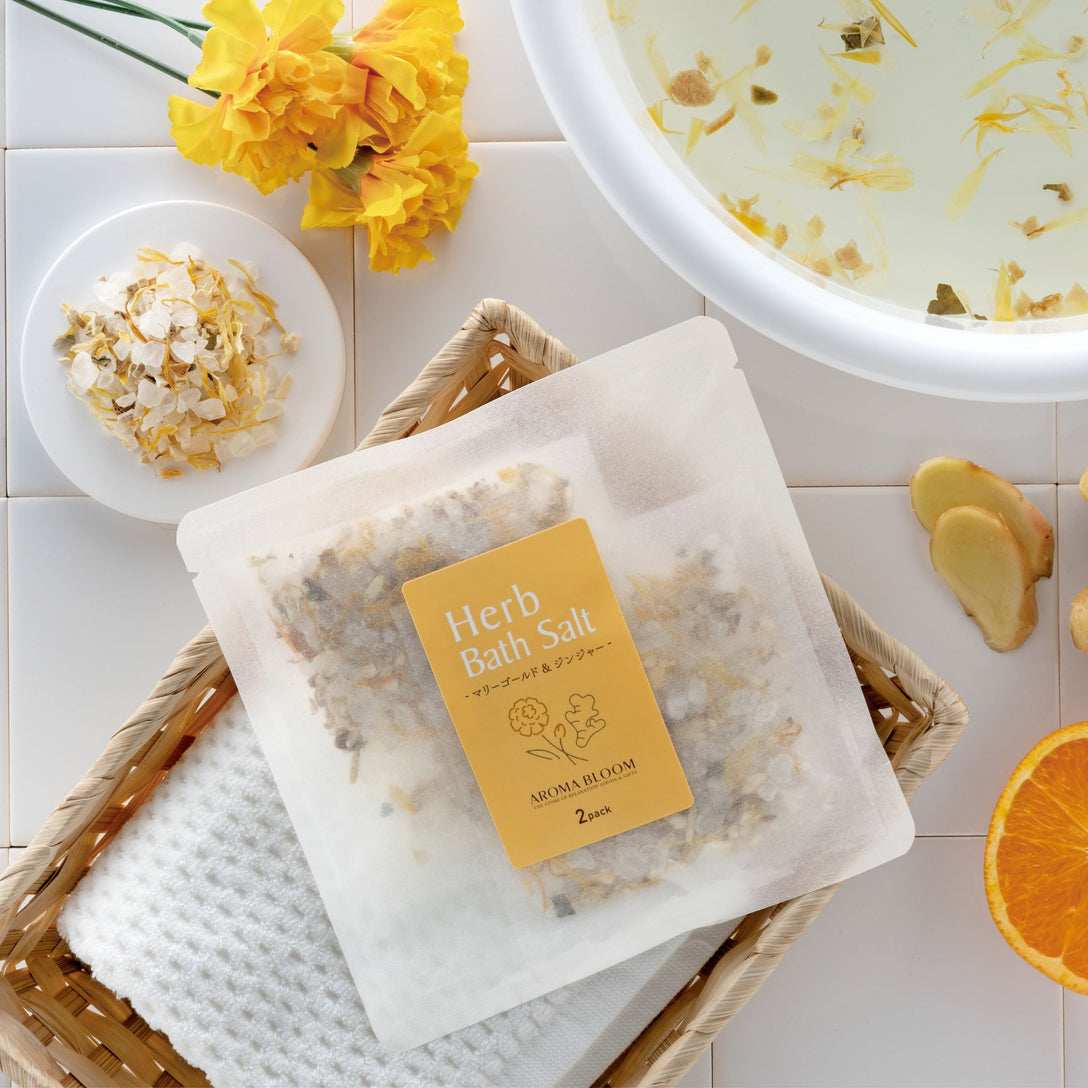 AROMA BLOOMのマリーゴールド&ジンジャーバスソルトは、血行を促進し、冷えにアプローチしてくれる温活入浴剤。